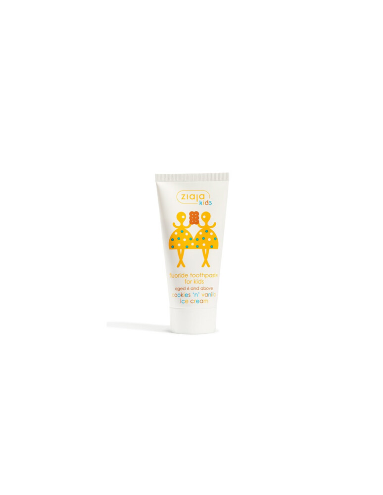Pasta dentífrica fluorada para dientes de leche, primeros molares y nuevos dientes permanentes. Sin azúcar, conservantes ni colorantes. Contiene fluoruro de sodio (0,135% de flúor o 1350ppm). Ziaja Kids.